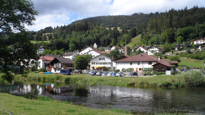 Der Morgen bricht an, Nebel liegt über dem Dorf, aber gegen die Sonne hat er keine Chance. Es ist warm. Wir machen einen kleinen Rundgang durch das Dorf. Es besteht aus alten Bauernhäusern im typischen Jurabaustil und einer alten Kirche. Das Frühstück ist reichhaltig: Käse, Brot, Zopf, Marmelade, Butter und jede Menge Kaffee. Wir müssen für den Tag vorsorgen. Ca. 9 Uhr brechen wir im schönsten Sonnenschein auf. Wir haben ja nicht nur die Wanderung, sondern auch die Rückfahrt vor uns. Nach Soubey verschmälert sich das Tal wieder. Die Ufer werden steiler. Beim Weiler Clairbief wird der Doubs Grenzfluss zwischen Schweiz und Frankreich. Kurz vor Goumois, unserem Ziel, verschwindet die Sonne hinter dicken Wolken, es donnert, und gleich darauf ergießt sich ein Wolkenbruch, wir fliehen auf der französischen Seite in ein Gaststätte und trinken Kaffee. So plötzlich wie es begonnen hat, verzieht sich das Gewitter auch wieder. Zuerst wollten wir nach Saignelegier zur Bahnstation wandern, aber es ist alles nass, die Wege sind rutschig und ich habe Blasen. Wir beschließen auf das Postauto zu warten, das uns pünktlich abholt. Über Glovelier, Basel, Müllheim und Freiburg kommen wir bei Gewitter und strömenden Regen in Emmendingen an. Es waren trotz des Unfalls zwei wunderschöne Tage in einer weitgehend unbekannten Landschaft.