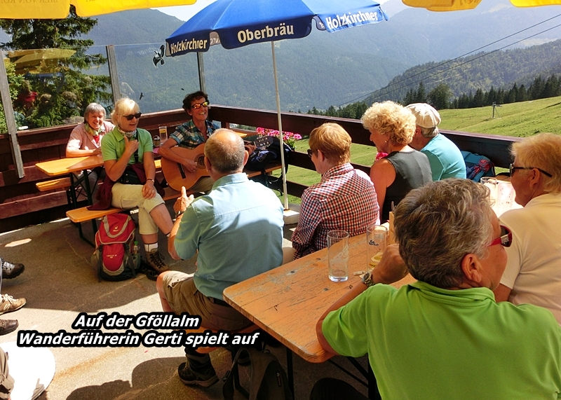 einem  strahlenden Tag mit azurblauem Himmel, erfolgte die Einführungsrunde aller Teilnehmer auf die Gföllalm im Skigebiet der Christlum-Lifte (Karwendel). Zu bewältigen waren zum Auftakt 900 Höhenmeter (hinauf und hinunter) und 9 Kilometer Strecke. Wanderführerin Gerti griff auf der Alm zur Gitarre und die Wanderfreunde sangen prächtig mit.