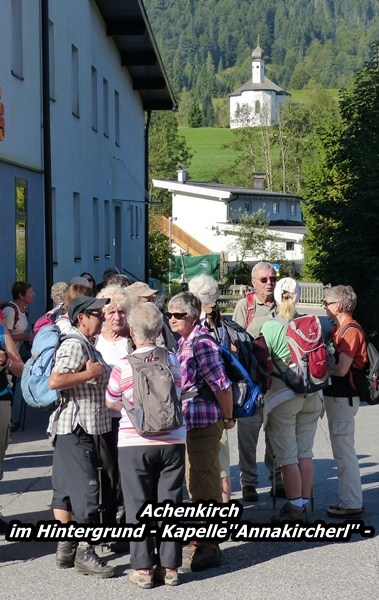 Frohgelaunt startete die Gruppe am 11. September  in Emmendingen, um über Schaffhausen, St. Gallen, St. Margareten, den Arlberg, Landeck, Innsbruck, Jenbach zum Achensee zu fahren. Im wunderschönen 4-Sterne-Hotel Achentalerhof mit seinem prächtigen Blumenschmuck wurde Quartier bezogen. Ein Gala-Diner am Abend verwöhnte die Wandergruppe und sollte Auftakt für eine auch kulinarisch geprägte Woche werden. Die Wandergesellschaft war schon voller Vorfreude, als Hotel-Seniorchefin Gerti, gleichzeitig Wanderführerin, den Wanderplan für die Woche erklärte, um alle Wanderer auf die kommenden Tage und die geplanten Touren  einzustimmen.